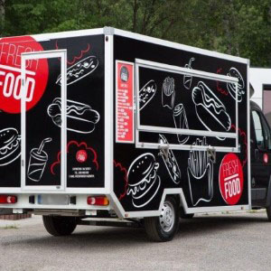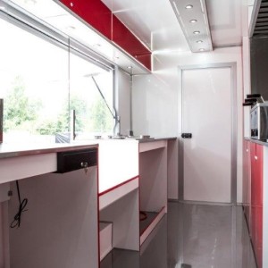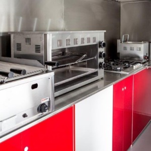 - zabudowa meblowa Linia Ultra Light czerwona przednia zamknięta z blatem pokrytym nierdzewką